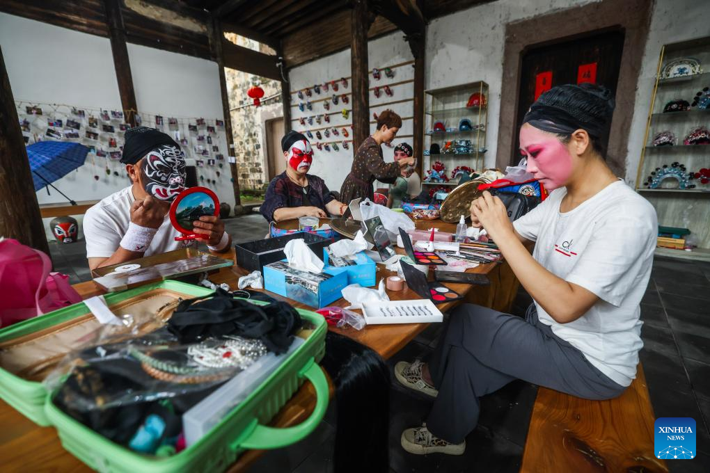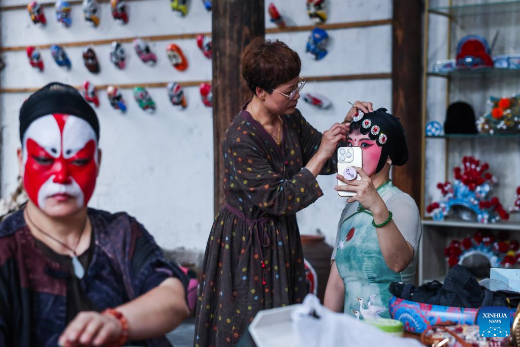 An artist from a local folk troupe of Wu Opera prepares to perform in Zhengdian Village of Lipu Town, Jinhua City, east China's Zhejiang Province on June 25, 2024. (Xinhua/Xu Yu)