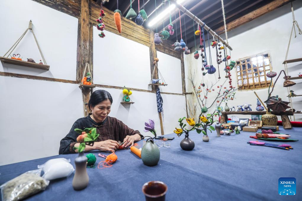 This photo taken on June 25, 2024 shows an intangible cultural heritage market showcasing handicraft works by local craftsmen in Zhengdian Village of Lipu Town, Jinhua City, east China's Zhejiang Province. (Xinhua/Xu Yu)