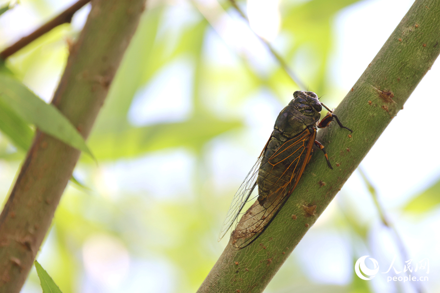 Photo shows a cicada on the willow branch in Wenbita Park in Tongan district of Xiamen, southeast China’s Fujian Province. (People’s Daily Online/Chen Bo)