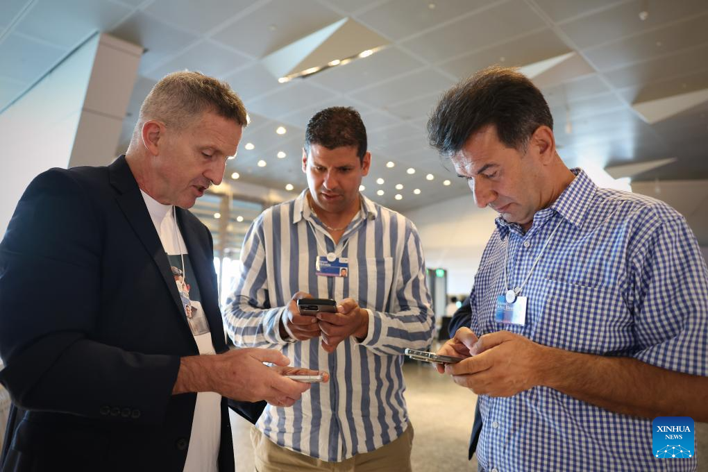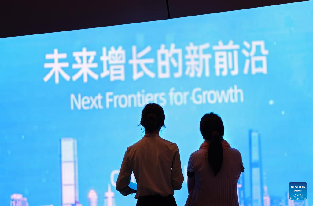 Participants exchange contact information during the 15th Annual Meeting of the New Champions, also known as the Summer Davos, at the Dalian International Conference Center in Dalian, northeast China's Liaoning Province, June 26, 2024. Featuring the theme "Next Frontiers for Growth," the event, held from June 25 to 27, gathers over 1,700 leading figures from the public and private sectors in more than 100 countries and regions to jointly explore new drivers and pathways for global economic growth. (Xinhua/Yao Jianfeng)