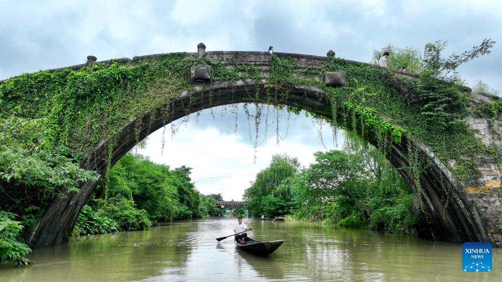 This drone photo taken on June 26, 2024 shows a man boating under the Shouchang Bridge in Erdu Village of Deqing County, east China's Zhejiang Province. Deqing County is home to seven ancient stone bridges which are listed as major cultural heritage sites under state-level protection. In recent years, the county has spared no effort in the protection and renovation of ancient stone bridges, while promoting the integration of its heritage resources with cultural tourism and research trips. (Photo by Xie Shangguo/Xinhua)