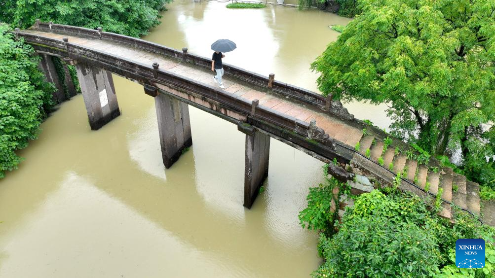 An aerial drone photo taken on June 27, 2024 shows a pedestrian walking on the Sheqiao Bridge in Longsheng Village of Deqing County, east China's Zhejiang Province. Deqing County is home to seven ancient stone bridges which are listed as major cultural heritage sites under state-level protection. In recent years, the county has spared no effort in the protection and renovation of ancient stone bridges, while promoting the integration of its heritage resources with cultural tourism and research trips. (Photo by Xie Shangguo/Xinhua)