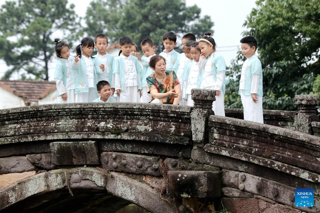 A volunteer tells the history of the Wanshan Bridge to a group of young visitors in Shebei Village of Xin'an Town, Deqing County, east China's Zhejiang Province, June 26, 2024. Deqing County is home to seven ancient stone bridges which are listed as major cultural heritage sites under state-level protection. In recent years, the county has spared no effort in the protection and renovation of ancient stone bridges, while promoting the integration of its heritage resources with cultural tourism and research trips. (Photo by Xie Shangguo/Xinhua)