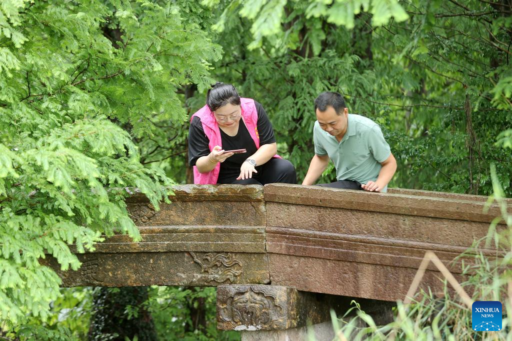 Cultural relics conservators conduct inspections on the Jianji Bridge in Longsheng Village of Deqing County, east China's Zhejiang Province, June 27, 2024. Deqing County is home to seven ancient stone bridges which are listed as major cultural heritage sites under state-level protection. In recent years, the county has spared no effort in the protection and renovation of ancient stone bridges, while promoting the integration of its heritage resources with cultural tourism and research trips. (Photo by Xie Shangguo/Xinhua)