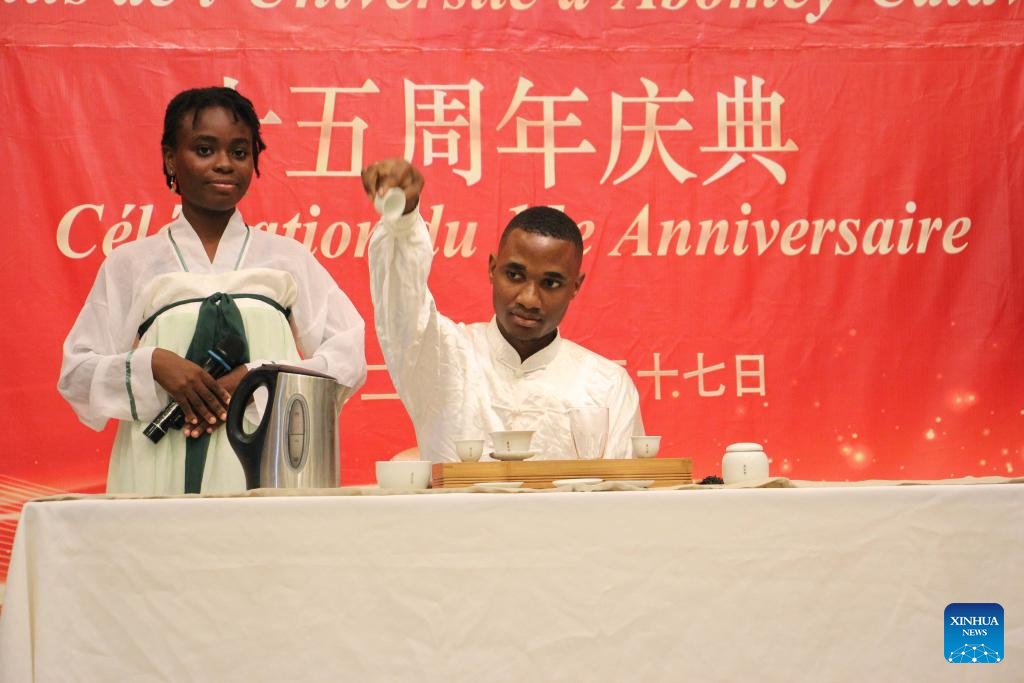 Student demonstrates Chinese tea art during the 15th anniversary of the Confucius Institute of the University of Abomey-Calavi at Chinese Cultural Center in Cotonou, Benin, June 27, 2024. (Photo by Seraphin Zounyekpe/Xinhua)