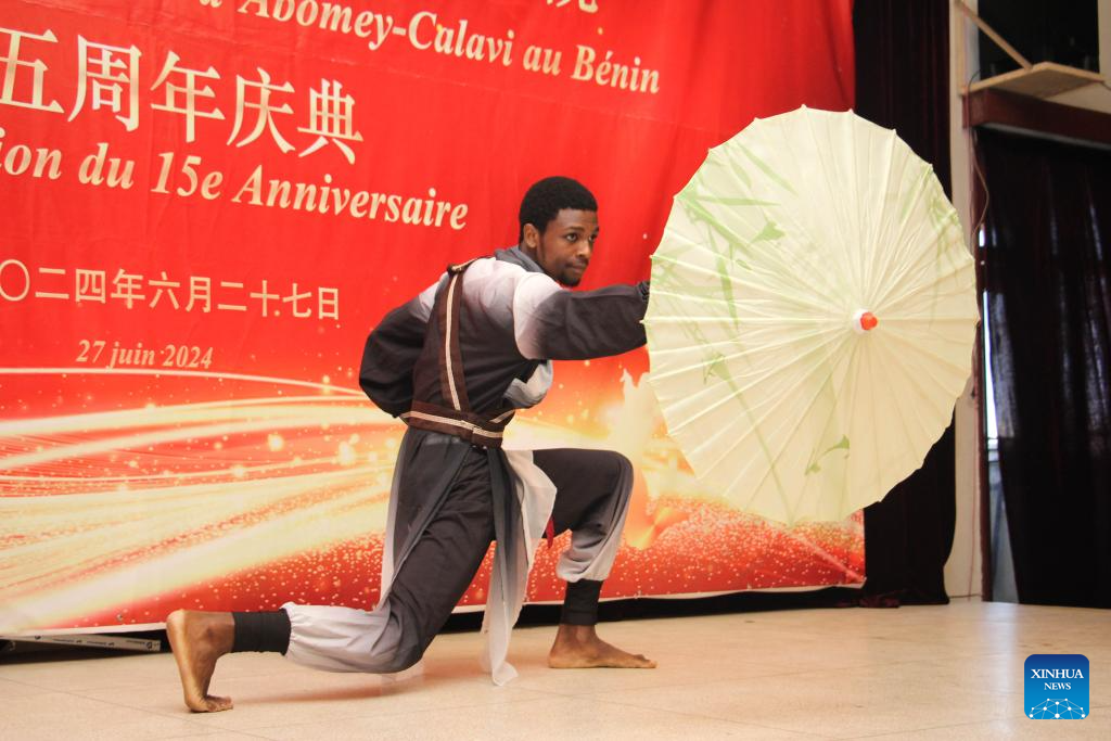 A student demonstrates traditional Chinese costume during the 15th anniversary of the Confucius Institute of the University of Abomey-Calavi at Chinese Cultural Center in Cotonou, Benin, June 27, 2024. (Photo by Seraphin Zounyekpe/Xinhua)