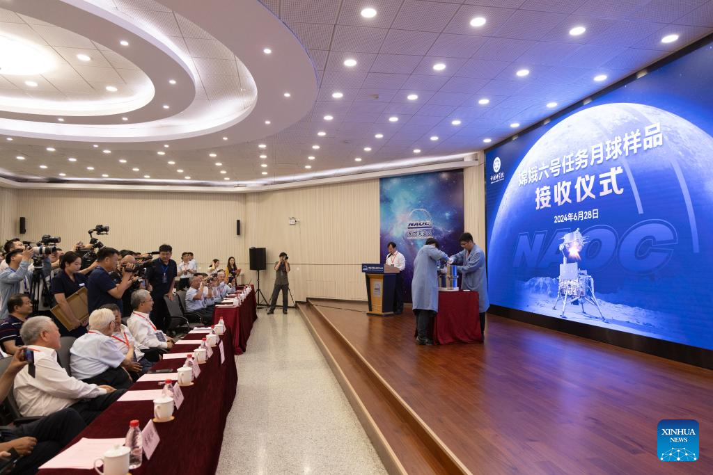 A reception ceremony for Chang'e-6 lunar samples is held at the National Astronomical Observatories under the Chinese Academy of Sciences (CAS) in Beijing, capital of China, June 28, 2024. A ceremony was held on Friday at the National Astronomical Observatories under the CAS to receive the lunar samples collected by China's Chang'e-6 probe. China's Chang'e-6 mission collected 1,935.3 grams of samples from the moon's far side, the China National Space Administration announced on Friday. (Xinhua/Jin Liwang)
