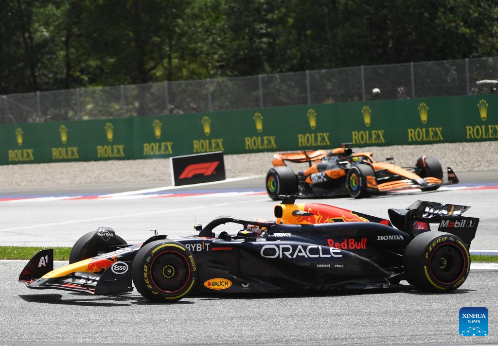 Red Bull Racing's Dutch driver Max Verstappen (front) competes during the first practice session of the Formula 1 Austrian Grand Prix in Spielberg, Austria, June 28, 2024. (Xinhua/He Canling)