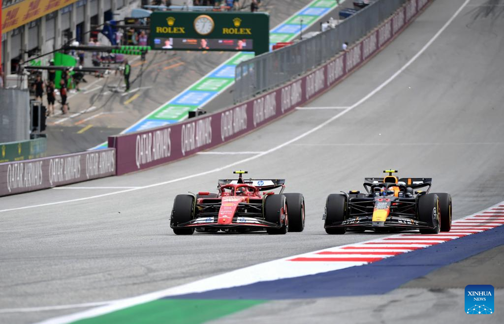 Ferrari's Spanish driver Carlos Sainz (L) and Red Bull Racing's Mexican driver Sergio Perez compete during the first practice session of the Formula 1 Austrian Grand Prix in Spielberg, Austria, June 28, 2024. (Xinhua/He Canling)