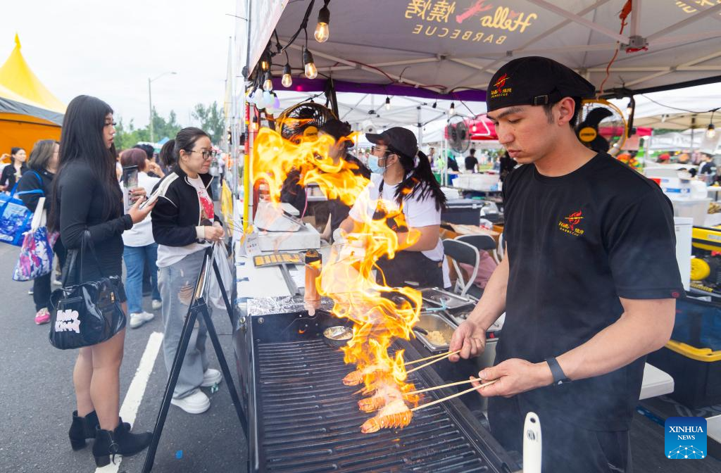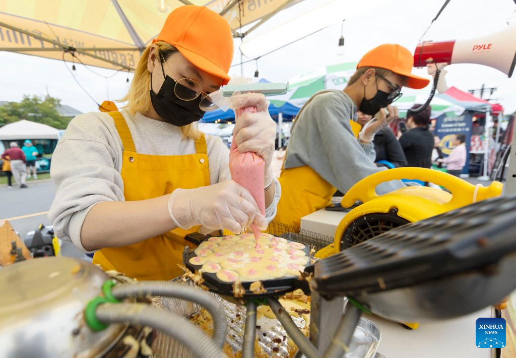 A cook (L) makes egg waffle during the 2024 Taste of Asia event in Markham, Canada, June 28, 2024.