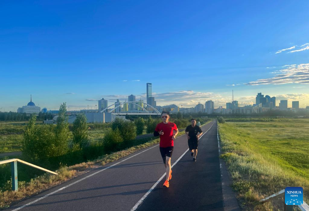 People jog at a park with the city skyline in the background in Astana, Kazakhstan, June 29, 2024. (Xinhua/Zhai Jianlan)
