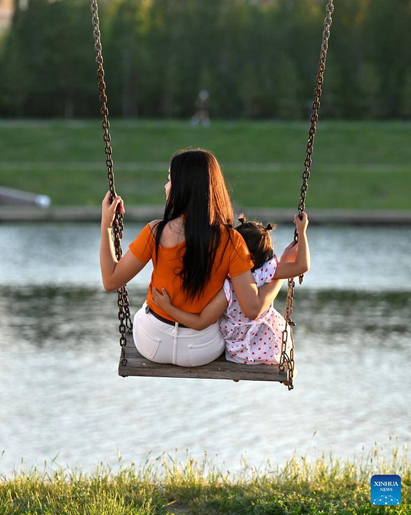 People enjoy their leisure time by the Ishim River in Astana, Kazakhstan, June 29, 2024. (Xinhua/Yue Yuewei)