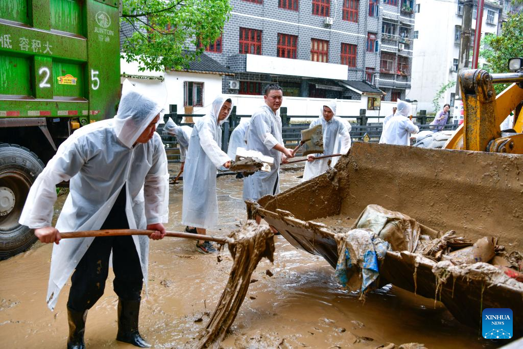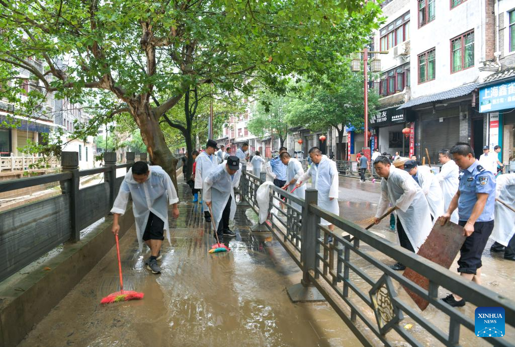 Police officers clean the street after flood in Zhenyuan County, southwest China's Guizhou Province, June 30, 2024. Parts of Zhenyuan County in Guizhou was hit by flood triggered by heavy rainfall from Friday to Saturday. (Xinhua/Yang Wenbin)