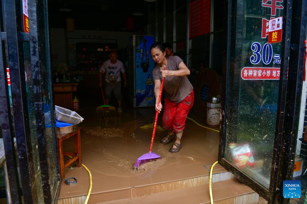 People clean a restaurant after flood in Zhenyuan County, southwest China's Guizhou Province, June 30, 2024. Parts of Zhenyuan County in Guizhou was hit by flood triggered by heavy rainfall from Friday to Saturday. (Xinhua/Yang Wenbin)