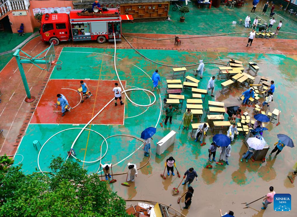 People do clean work after flood at a school in Zhenyuan County, southwest China's Guizhou Province, June 30, 2024. Parts of Zhenyuan County in Guizhou was hit by flood triggered by heavy rainfall from Friday to Saturday. (Xinhua/Yang Wenbin)