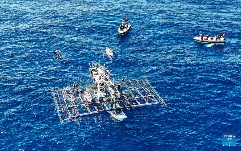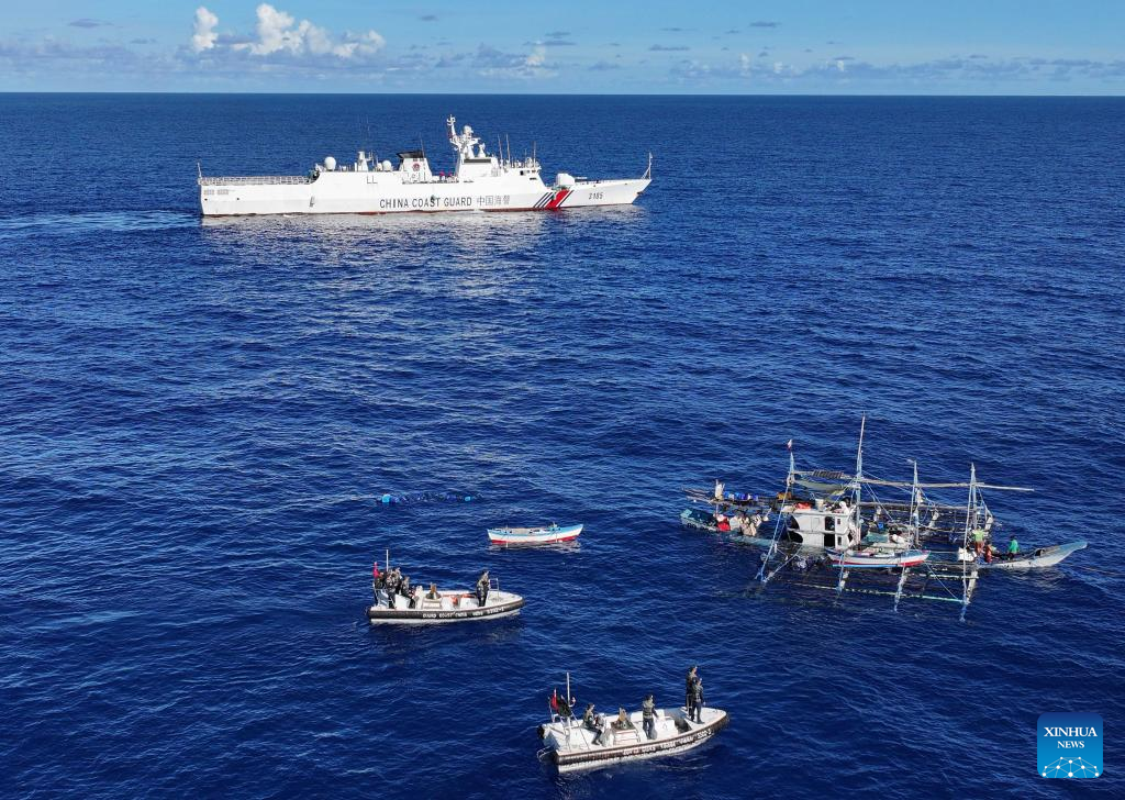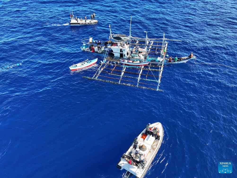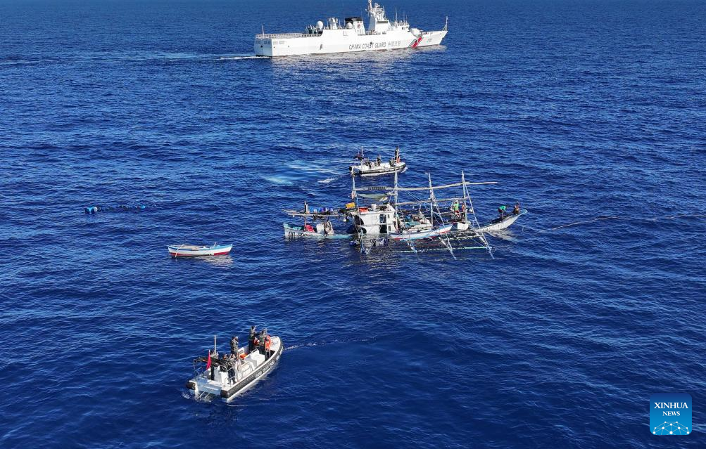 An aerial drone photo taken on June 29, 2024 shows the China Coast Guard assisting injured Filipino fishermen in waters adjacent to China's Huangyan Dao. (Xinhua/Deng Hua)
