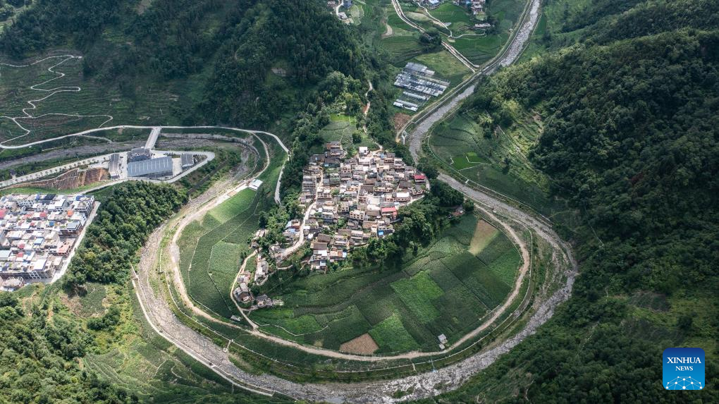 An aerial drone photo taken on June 27, 2023 shows a rural road in a township of Panzhou City, southwest China's Guizhou Province. In the past ten years, the rural road network in Guizhou Province has been significantly improved. By the end of 2023, the total mileage of rural roads in Guizhou has reached 185,000 kilometers. (Xinhua/Tao Liang)