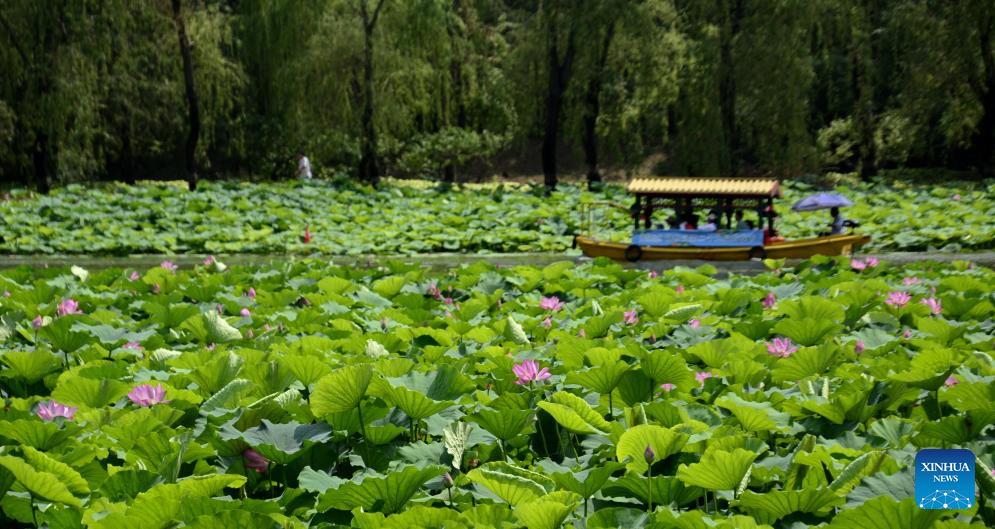Visitors enjoy blooming lotus flowers by boats at Yuanmingyuan Park in Beijing, capital of China, June 30, 2024. (Xinhua/Li Xin)