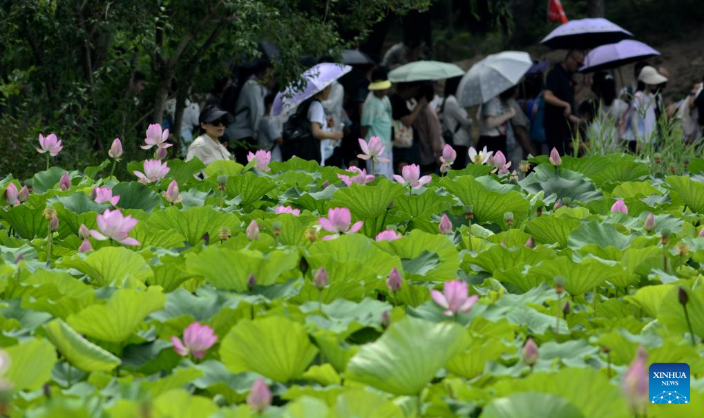Visitors enjoy blooming lotus flowers at Yuanmingyuan Park in Beijing, capital of China, June 30, 2024. (Xinhua/Li Xin)