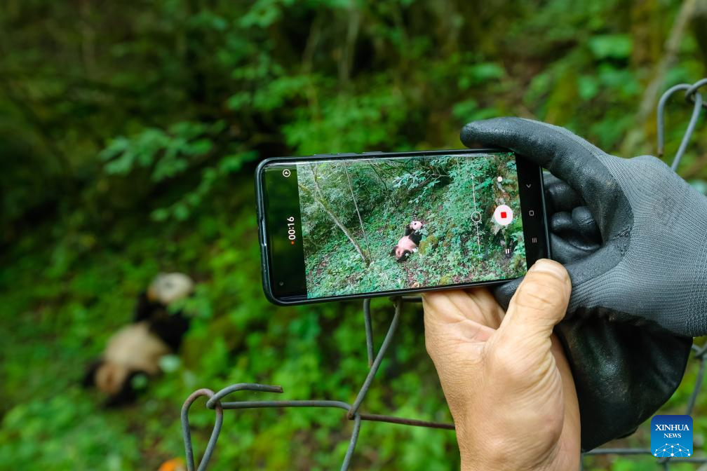 Staff member Mu Shijie records videos of giant panda Xian Xian outside the second-phase giant panda wild training fields of Tiantai Mountain in Wolong National Nature Reserve in southwest China's Sichuan Province, June 24, 2024. (Xinhua/Shen Bohan)