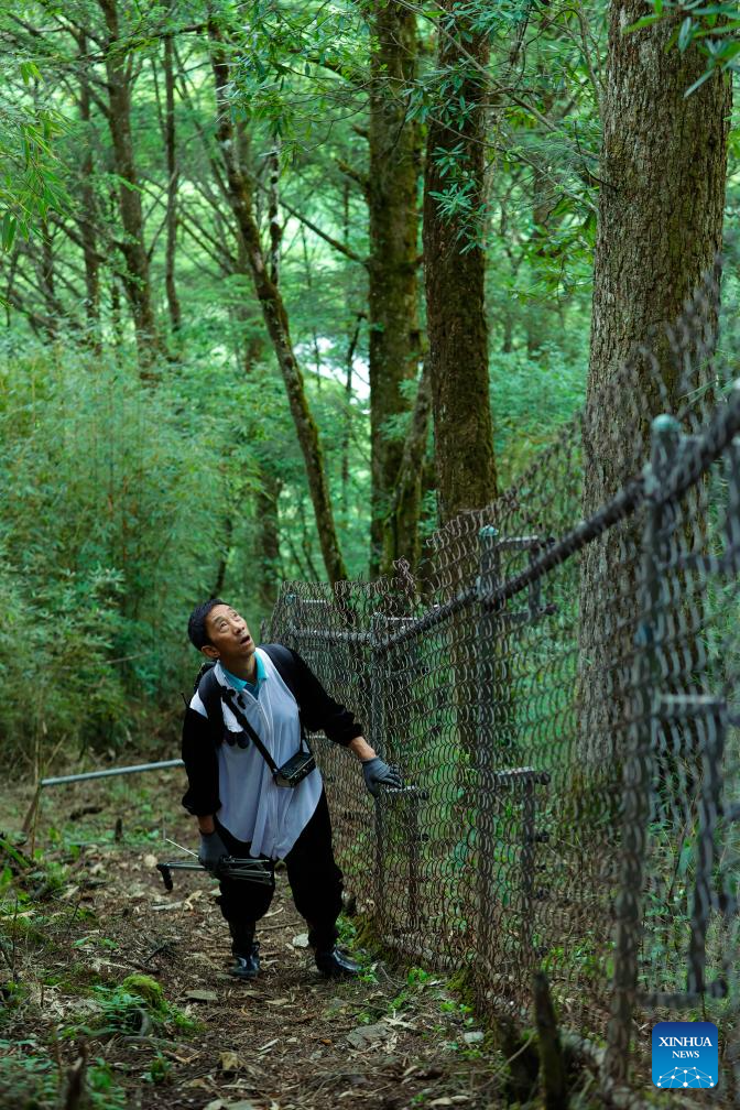 Staff member Mu Shijie looks for giant panda cubs while patrolling the second-phase giant panda wild training fields of Tiantai Mountain in Wolong National Nature Reserve in southwest China's Sichuan Province, June 24, 2024. (Xinhua/Shen Bohan)