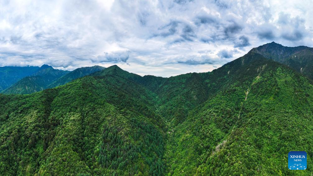 An aerial drone photo taken on June 24, 2024 shows a view of giant panda wild training fields of Tiantai Mountain in Wolong National Nature Reserve in southwest China's Sichuan Province, June 24, 2024. (Xinhua/Shen Bohan)