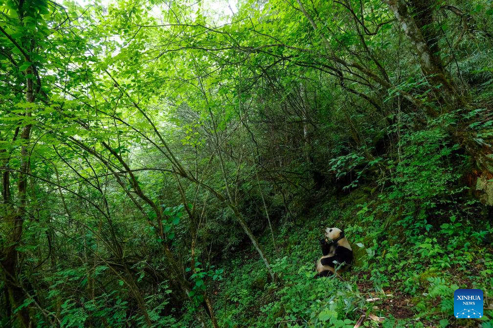 Giant panda Xian Xian is pictured at the second-phase giant panda wild training fields of Tiantai Mountain in Wolong National Nature Reserve in southwest China's Sichuan Province, June 24, 2024. (Xinhua/Shen Bohan)