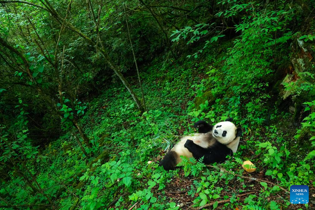 Giant panda Xian Xian has food at the second-phase giant panda wild training fields of Tiantai Mountain in Wolong National Nature Reserve in southwest China's Sichuan Province, June 24, 2024. (Xinhua/Shen Bohan)