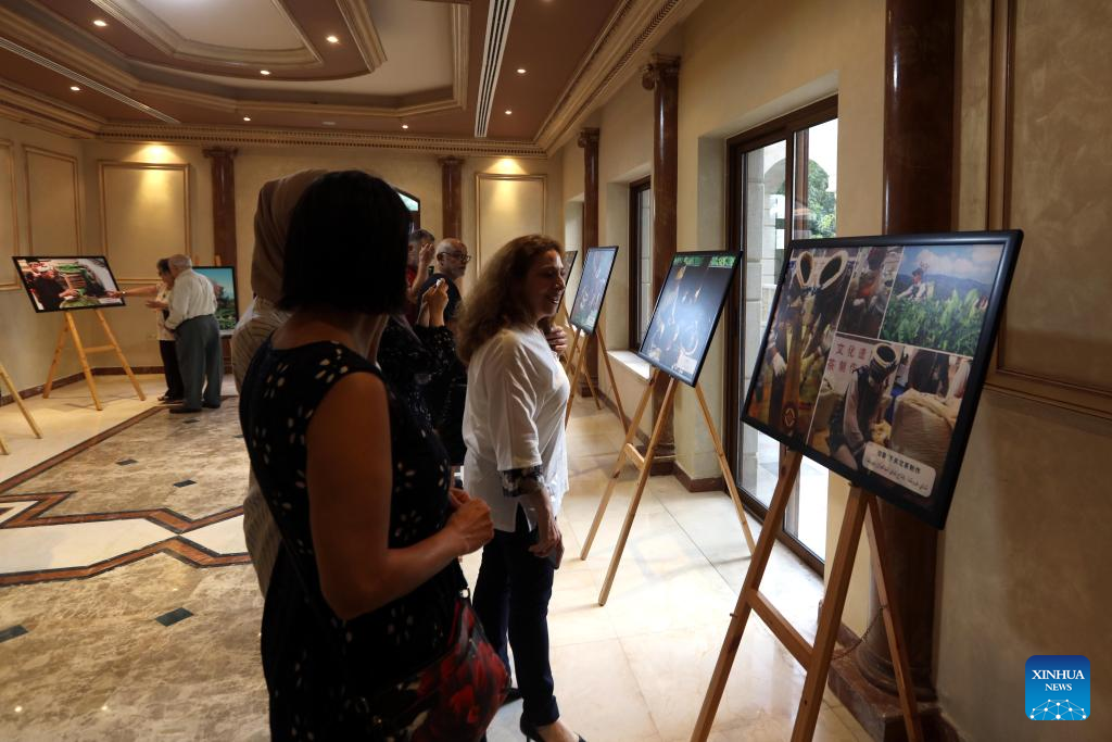People look at pictures about tea culture of southern China's Yunnan Province in the China Cultural Center in Amman, Jordan on June 30, 2024. (Photo by Mohammad Abu Ghosh/Xinhua)