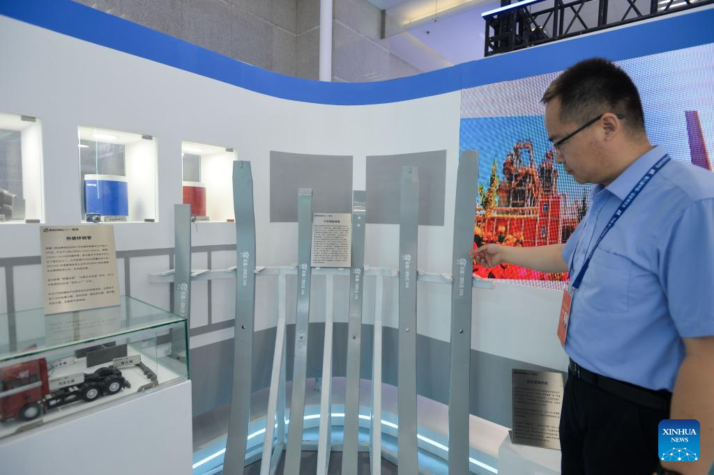 A staff member introduces steel products at the 8th China-Eurasia Expo in Urumqi, northwest China's Xinjiang Uygur Autonomous Region, June 30, 2024. Themed "New Opportunities of Silk Road, New Vitality for Eurasian Cooperation," the five-day expo that opened on June 26 has drawn over 1,900 participants from 50 countries, regions and international organizations, showcasing over 6,000 varieties of products. (Xinhua/Li Renzi)