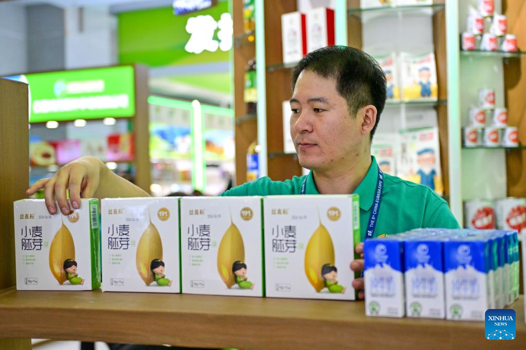 A staff member puts wheat germ products in place at the 8th China-Eurasia Expo in Urumqi, northwest China's Xinjiang Uygur Autonomous Region, June 26, 2024. Themed "New Opportunities of Silk Road, New Vitality for Eurasian Cooperation," the five-day expo that opened on June 26 has drawn over 1,900 participants from 50 countries, regions and international organizations, showcasing over 6,000 varieties of products. (Xinhua/Ding Lei)