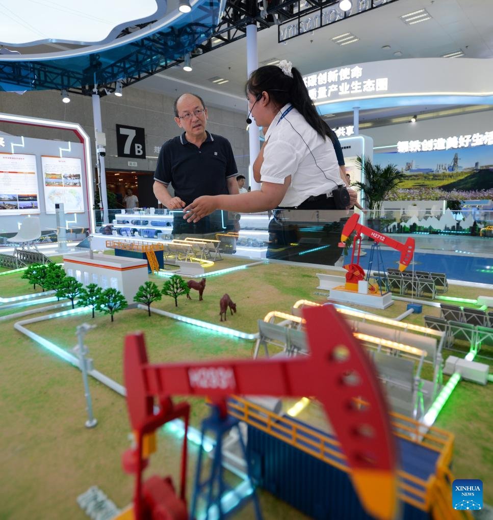 A staff member of an oilfield company talks with a visitor at the 8th China-Eurasia Expo in Urumqi, northwest China's Xinjiang Uygur Autonomous Region, June 30, 2024. Themed "New Opportunities of Silk Road, New Vitality for Eurasian Cooperation," the five-day expo that opened on June 26 has drawn over 1,900 participants from 50 countries, regions and international organizations, showcasing over 6,000 varieties of products. (Xinhua/Li Renzi)