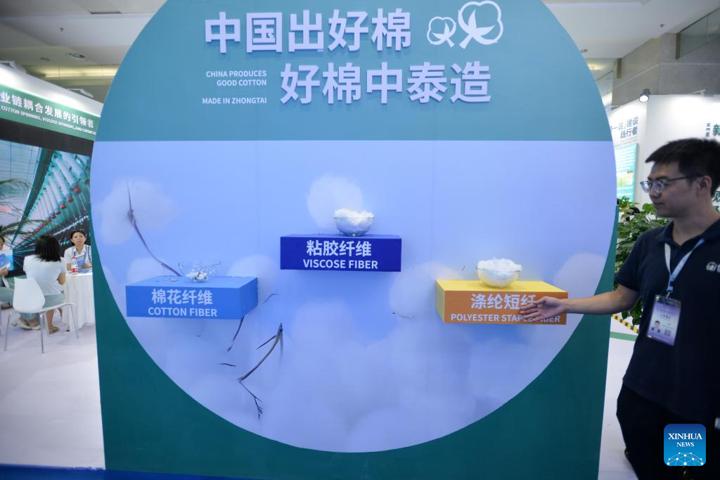 A staff member introduces textile fibers at the 8th China-Eurasia Expo in Urumqi, northwest China's Xinjiang Uygur Autonomous Region, June 30, 2024. Themed "New Opportunities of Silk Road, New Vitality for Eurasian Cooperation," the five-day expo that opened on June 26 has drawn over 1,900 participants from 50 countries, regions and international organizations, showcasing over 6,000 varieties of products. (Xinhua/Li Renzi)