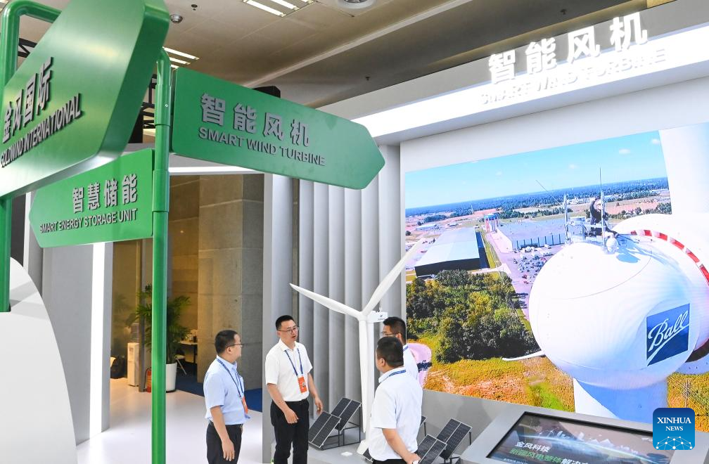 Exhibitors learn about a smart wind turbine at the 8th China-Eurasia Expo in Urumqi, northwest China's Xinjiang Uygur Autonomous Region, June 27, 2024. Themed "New Opportunities of Silk Road, New Vitality for Eurasian Cooperation," the five-day expo that opened on June 26 has drawn over 1,900 participants from 50 countries, regions and international organizations, showcasing over 6,000 varieties of products. (Xinhua/Wang Fei)