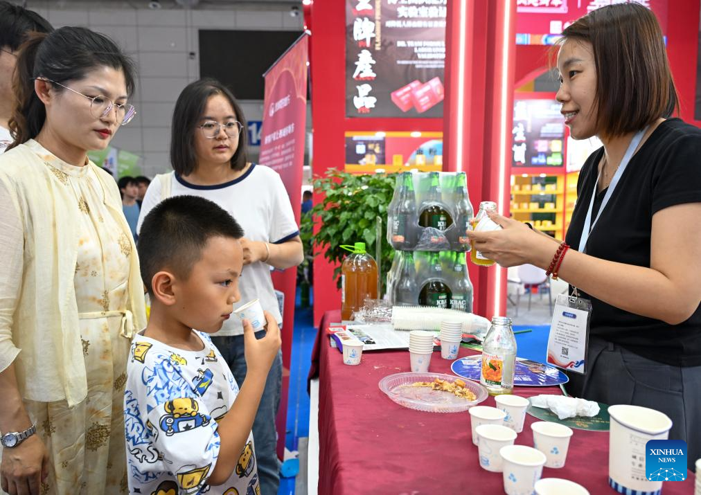 A child tastes sea-buckthorn juice at the 8th China-Eurasia Expo in Urumqi, northwest China's Xinjiang Uygur Autonomous Region, June 30, 2024. Themed "New Opportunities of Silk Road, New Vitality for Eurasian Cooperation," the five-day expo that opened on June 26 has drawn over 1,900 participants from 50 countries, regions and international organizations, showcasing over 6,000 varieties of products. (Xinhua/Chen Shuo)