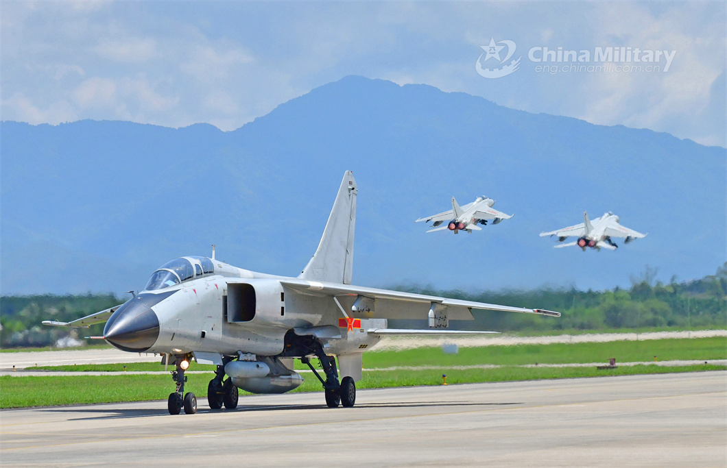 Fighter jets attached to an aviation brigade under the PLA Air Force take off in formation during a flight training exercise on June 14, 2024. (eng.chinamil.com.cn/Photo by Zhuo Lingpeng)