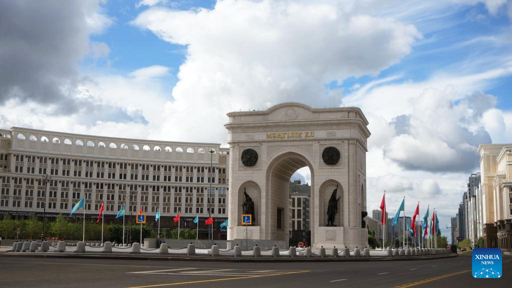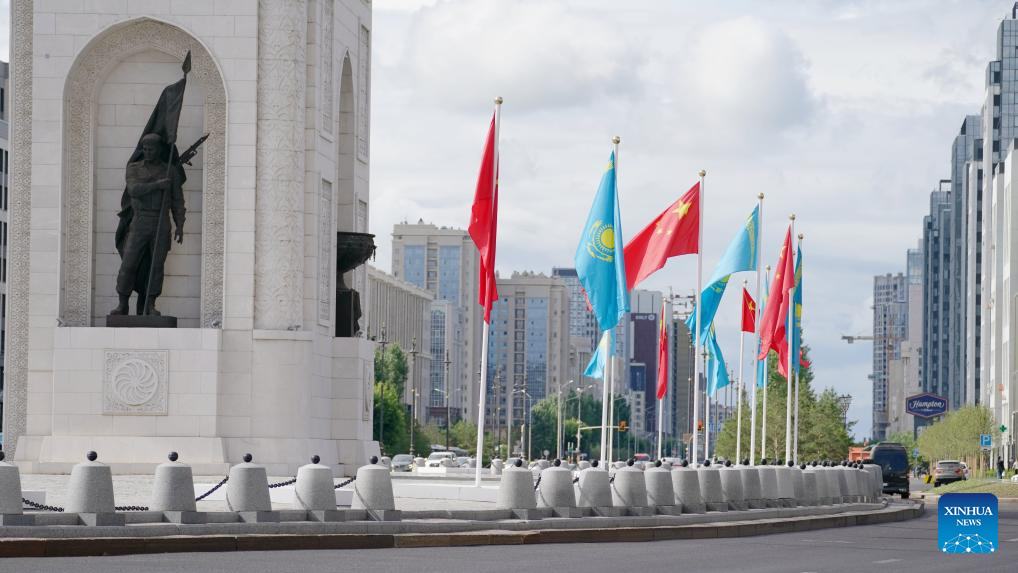 Chinese and Kazakh national flags are seen hoisted in Astana, Kazakhstan, July 2, 2024. (Xinhua/Wang Jianhua)