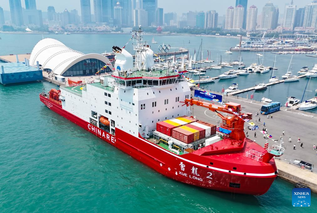 This photo taken on July 3, 2024 shows China's icebreaker Xuelong 2 berthing at the pier of Qingdao Olympic Sailing Center in Qingdao, east China's Shandong Province. China's icebreaker Xuelong 2 and icebreaker research vessel Jidi were open to public here on Wednesday. This is also the first time for Jidi, China's independently designed and built icebreaker research vessel, to allow for public visit since its official delivery on June 24 this year.(Photo by Zhang Jingang/Xinhua)