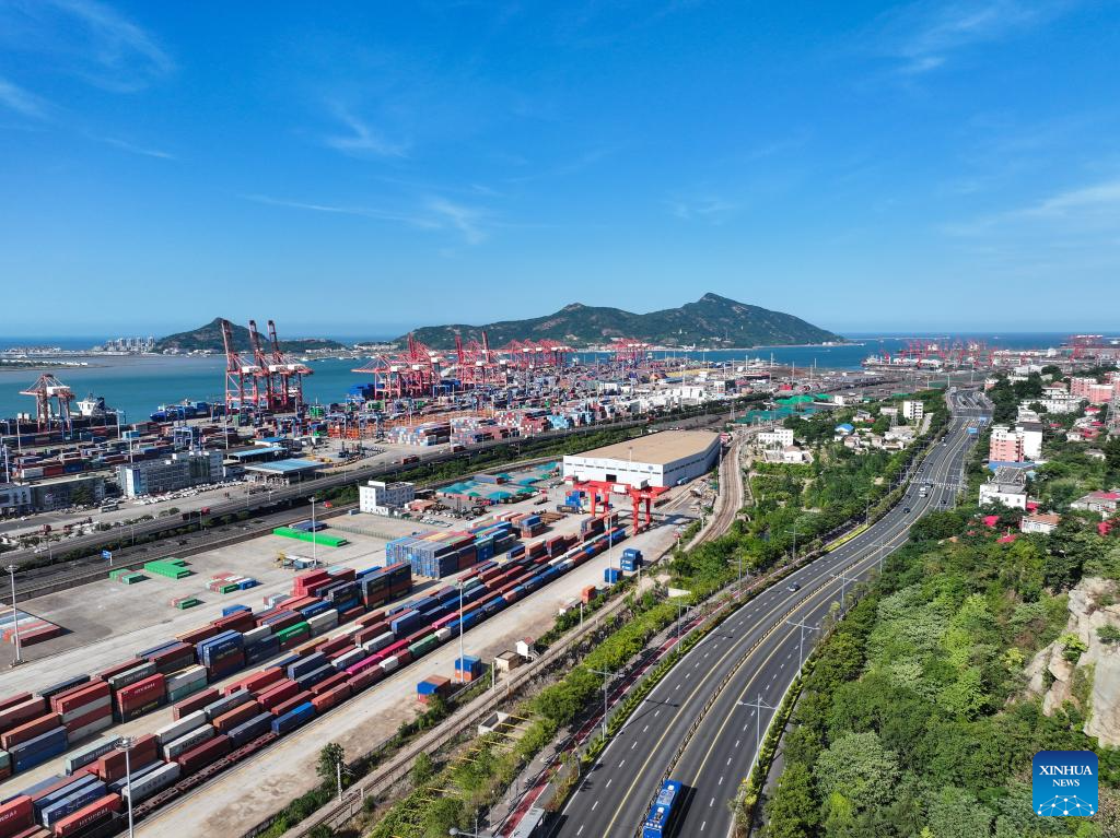 An aerial drone photo taken on June 26, 2024 shows freight ships docked at the container terminal of Lianyungang Port, east China's Jiangsu Province. (Xinhua/Ji Chunpeng)