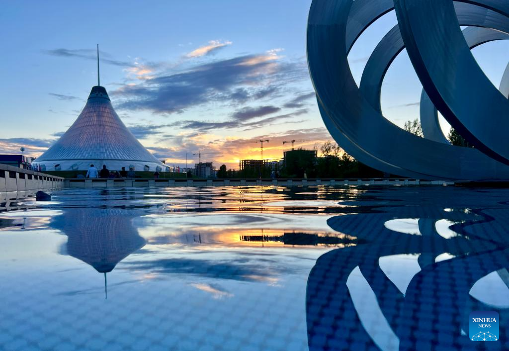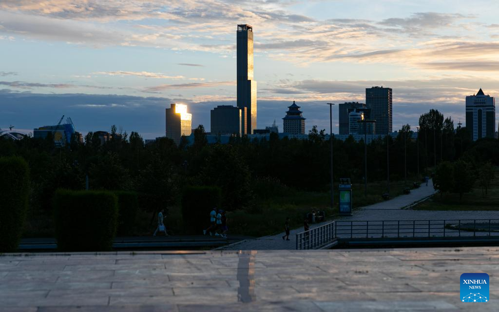 This photo taken on July 2, 2024 shows a view of the city skyline at sunset in Astana, Kazakhstan. (Xinhua/Wang Jianhua)