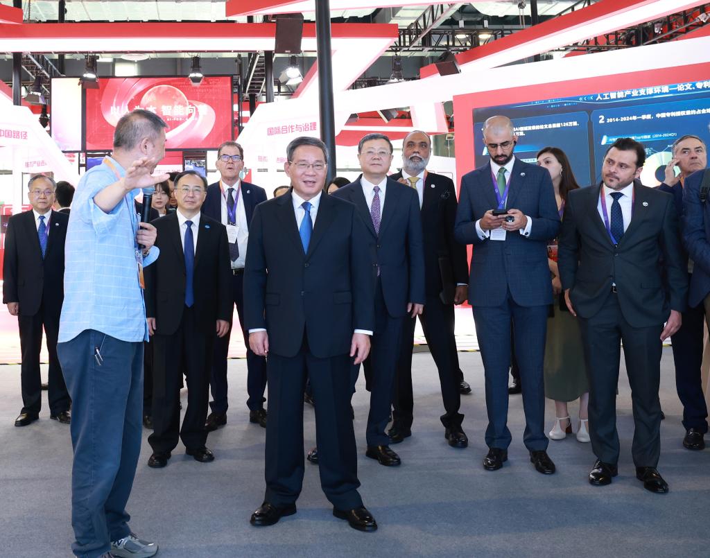 Chinese Premier Li Qiang tours the venue of the 2024 World AI Conference and High-Level Meeting on Global AI Governance with foreign guests and representatives from international organizations after the opening ceremony of the events in Shanghai, east China, July 4, 2024. Li on Thursday attended the opening ceremony of the 2024 World AI Conference and High-Level Meeting on Global AI Governance and delivered a speech. (Xinhua/Wang Ye)