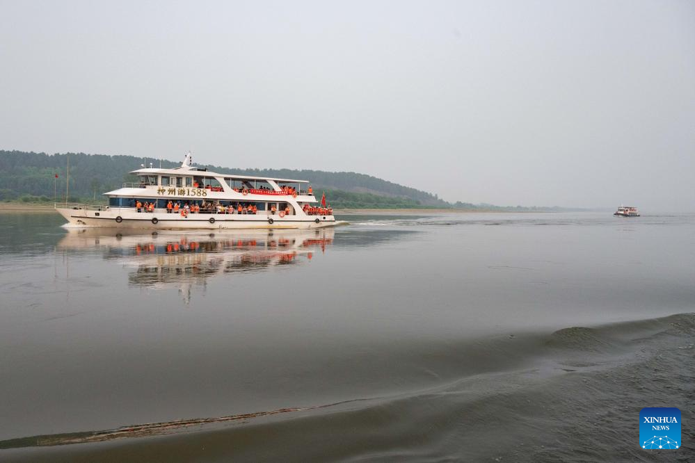 Tourists take a sightseeing boat on the Heilongjiang River in Mohe, northeast China's Heilongjiang Province, July 2, 2024. Lots of visitors travel to Mohe, China's northernmost city, in summer to enjoy some leisure time. In recent years, Mohe, focusing on its unique location, continues to improve its infrastructure and develop tourism products to attract more tourists in all seasons. (Xinhua/Xie Jianfei)