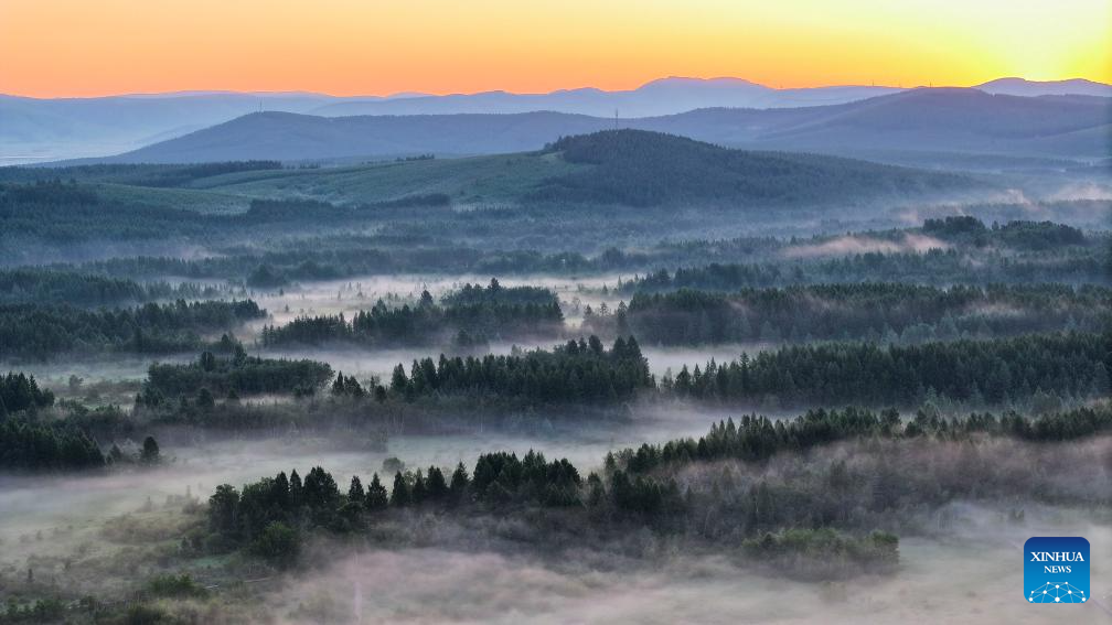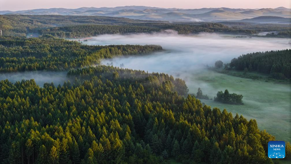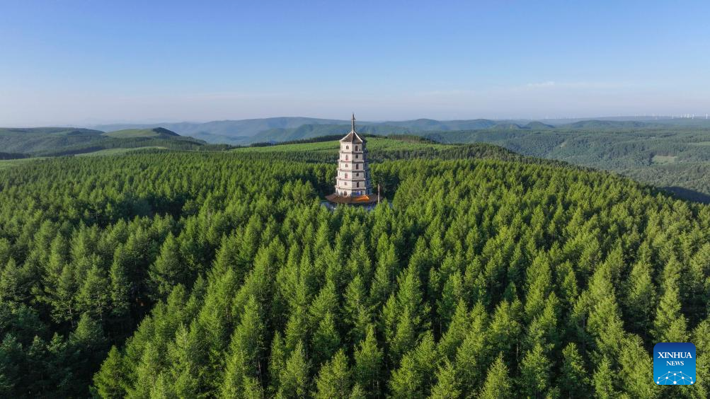 An aerial drone photo taken on early July 5, 2024 shows a view of the Saihanba National Forest Park in Chengde City, north China's Hebei Province. (Photo by Liu Mancang/Xinhua)