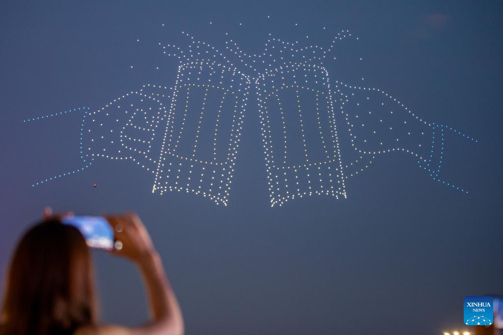 An aerial drone photo taken on July 6, 2024 shows a drone light show at the 22nd China Harbin International Beer Festival in Harbin, northeast China's Heilongjiang Province. The 22nd China Harbin International Beer Festival opened here on Saturday. (Xinhua/Zhang Tao)