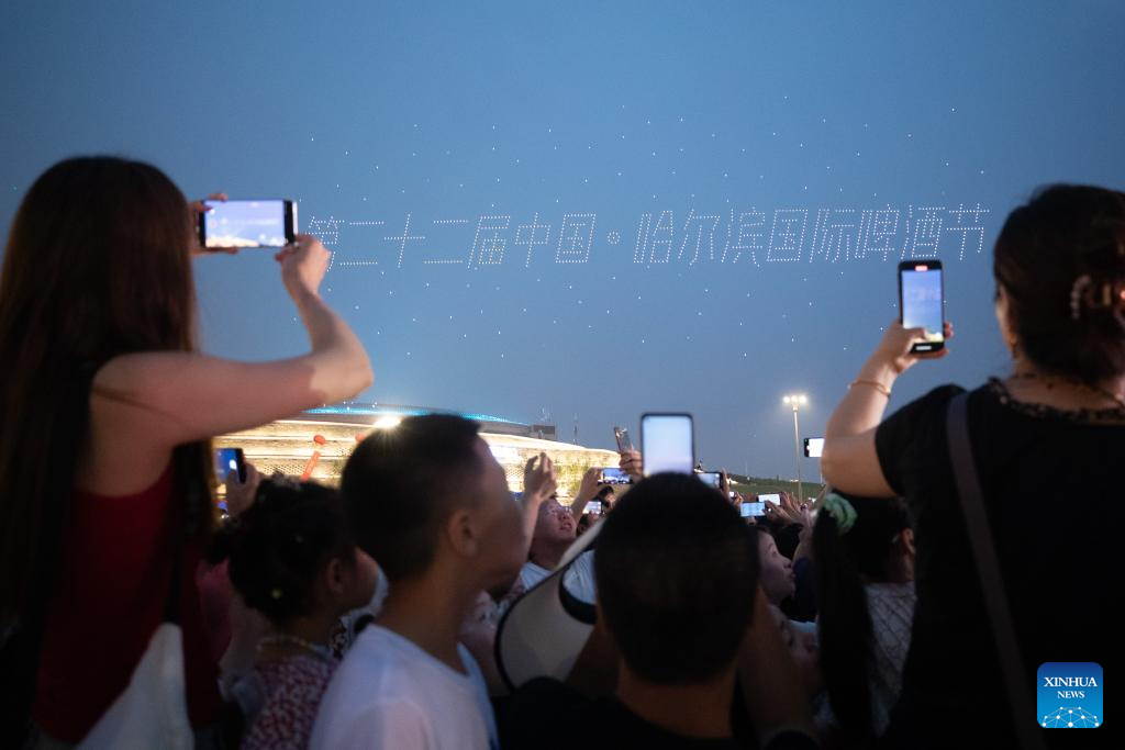 People watch a drone light show at the 22nd China Harbin International Beer Festival in Harbin, northeast China's Heilongjiang Province, July 6, 2024. The 22nd China Harbin International Beer Festival opened here on Saturday. (Xinhua/Zhang Tao)