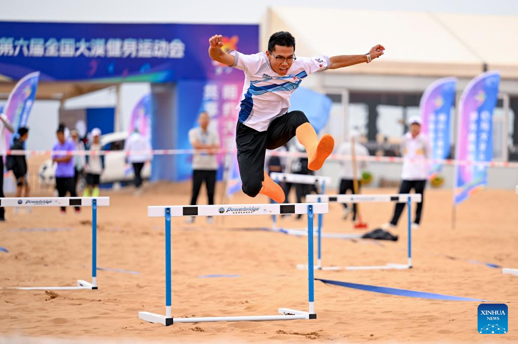 A contestant competes in a parent-child obstacle race event during the desert fun games at Shapotou scenic spot in Zhongwei, northwest China's Ningxia Hui Autonomous Region, July 7, 2024. The desert fun games is being held here from July 6 to 8, expected to attract more than 1,000 contestants. (Xinhua/Feng Kaihua)