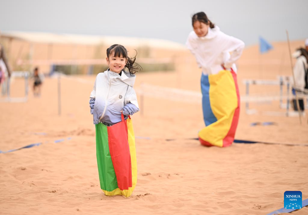 A contestant competes in a parent-child treasure hunting event during the desert fun games at Shapotou scenic spot in Zhongwei, northwest China's Ningxia Hui Autonomous Region, July 7, 2024. The desert fun games is being held here from July 6 to 8, expected to attract more than 1,000 contestants. (Xinhua/Feng Kaihua)