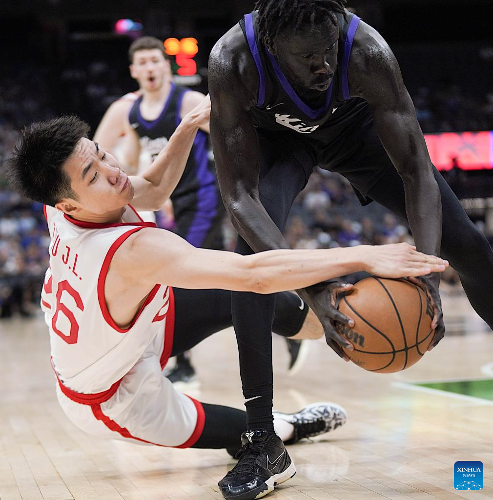 Jo Lual-Acuil Jr. (R) of Sacramento Kings 1 vies with Zhu Junlong of China during the match between China and Sacramento Kings 1 at the 2024 California Classic NBA Summer League at the Golden 1 center in Sacramento, the United States, July 6, 2024. (Xinhua/Wu Xiaoling)