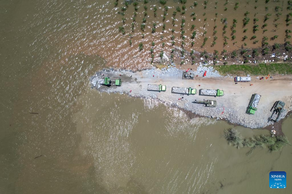 An aerial drone photo shows rescuers working to block the dike breach in the Dongting Lake in Huarong County, central China's Hunan Province, July 7, 2024. (Xinhua/Chen Sihan)
