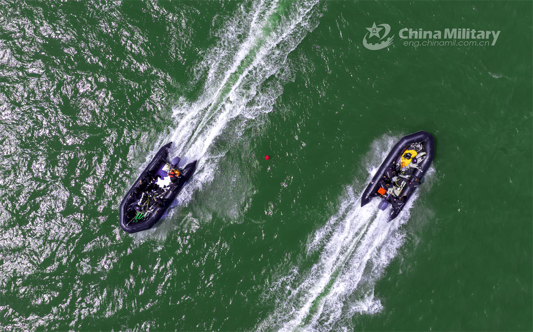 Anti-mine frogmen assigned to a group under the PLA Navy take combat rubber raiding crafts (CRRC) to the designated waters during a mine-hunting diving training exercise in mid-June, 2024. (eng.chinamil.com.cn/Photo by Wang Hu)
